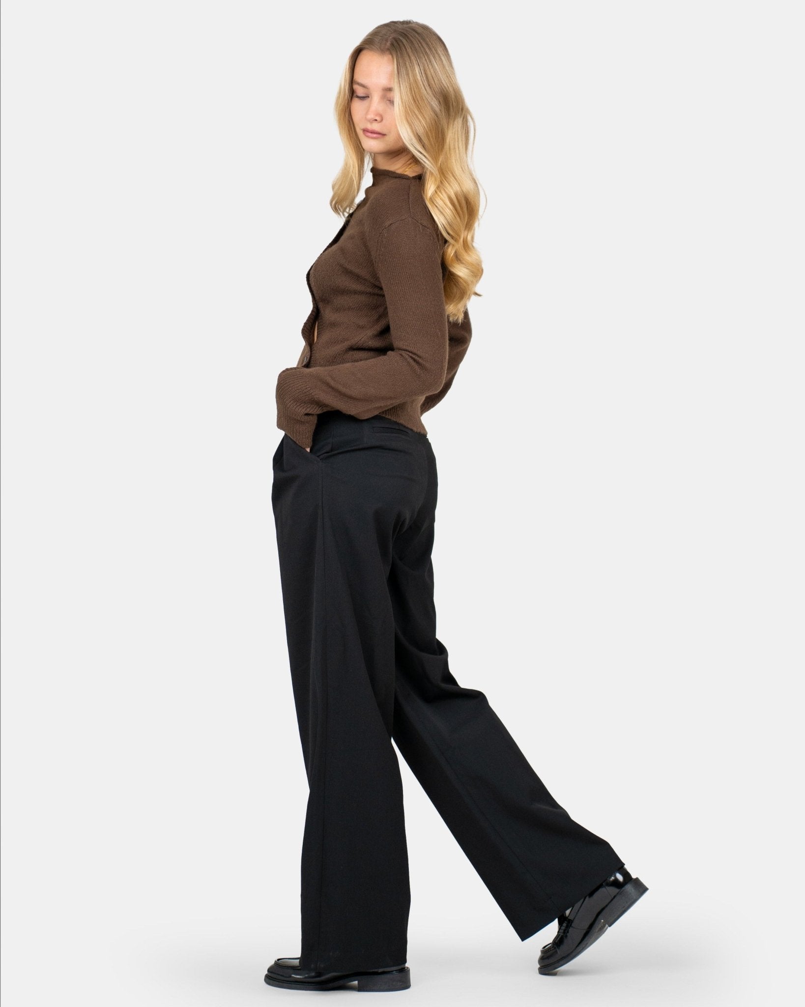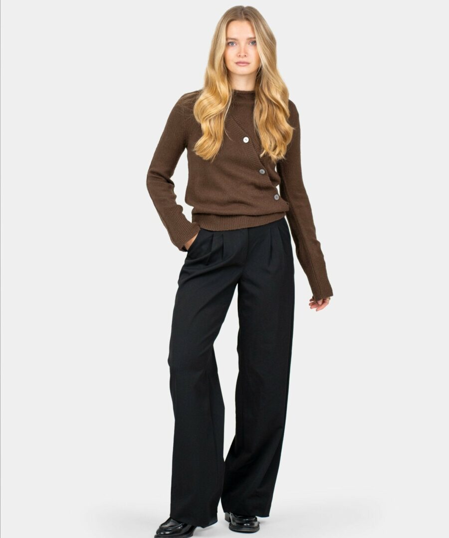 This asymmetrical cardigan is the perfect combination of style and comfort. It is made of 100% acrylic, which gives a light and soft sensation. The cardigan has a unique asymmetric cut that creates a modern and stylish expression. The versatile design makes it easy to combine with both jeans and dresses, making it an indispensable part of your wardrobe.