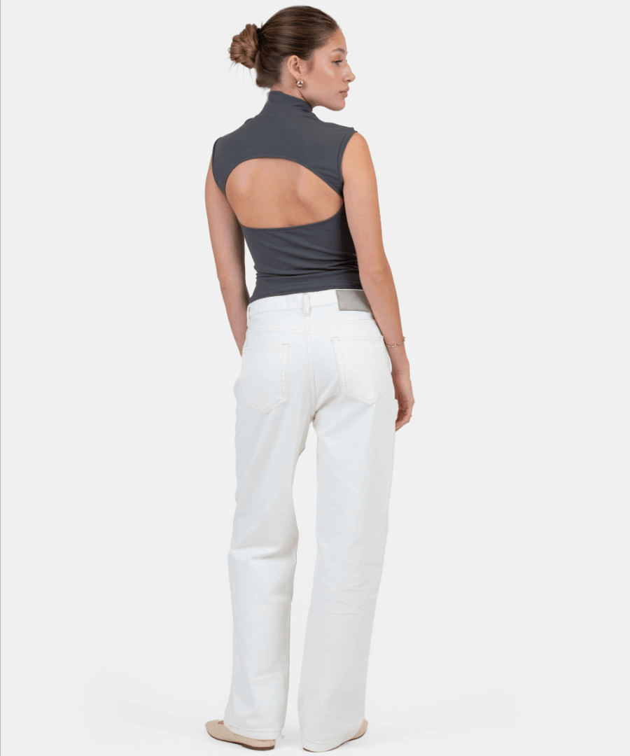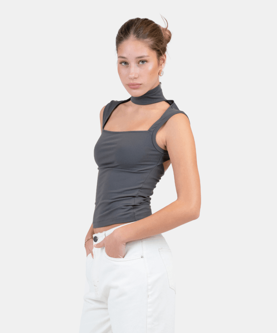 This gray choke-top is the perfect combination of simplicity and modern design. The built-in choke creates a stylish detail that makes the top a statement-piece in your wardrobe. The gray tone gives you endless styling options, while the soft fabric ensures comfort throughout the day. Use it as part of a chic everyday look with jeans and sneakers, or dress it up with accessories and a blazer for a more formal occasion. Either way, this top will add a subtle elegance to your outfit.