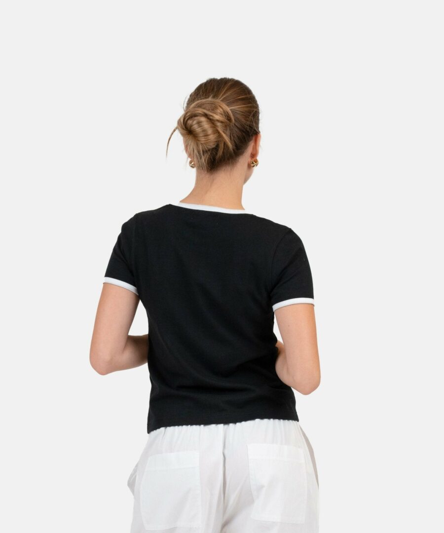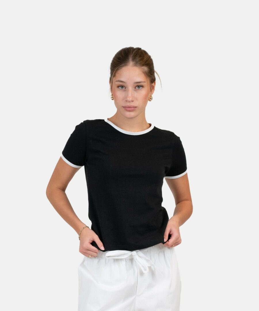 A Basic T-shirt is a must have in your wardrobe and can be used for all occasions. We have added a contrast detail on the sleeves and neckline to give the classic T-shirt an exclusive look. In addition to the carefully selected design details, the t-shirt is made of 100% cotton, making the t-shirt soft and comfortable to wear all day. Style our black contrast baby tee with a few of our white pajama pants and a knit cardigan.