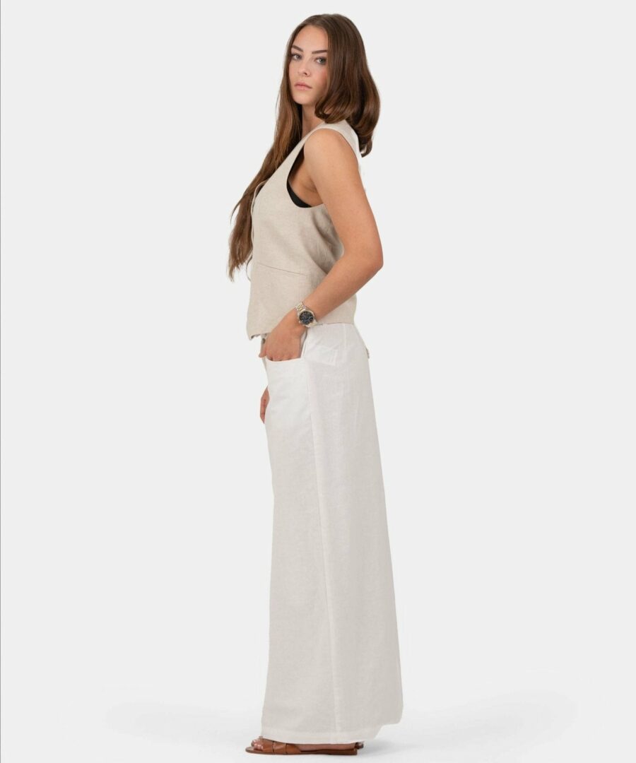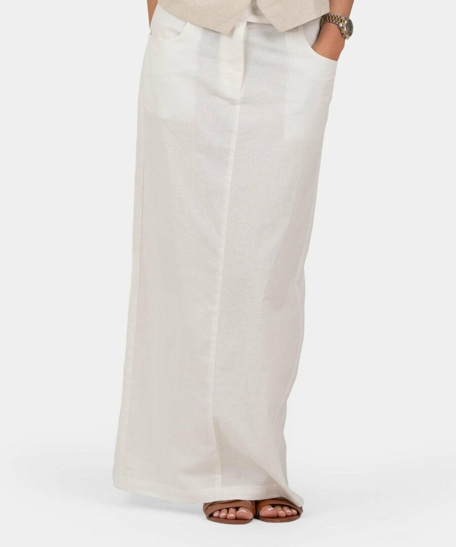 This beautiful white is a long maxi skirt that almost reaches down to the ankles. With belt straps, front pockets and a slit back, it combines style and functionality in an elegant way. Designed to create a flattering silhouette, it fits perfectly with the body and gives you a sophisticated look. Style our white flax skirt with it To complete the look to a stylish everyday look or with our popular Hør T-Shirt for a more casual look