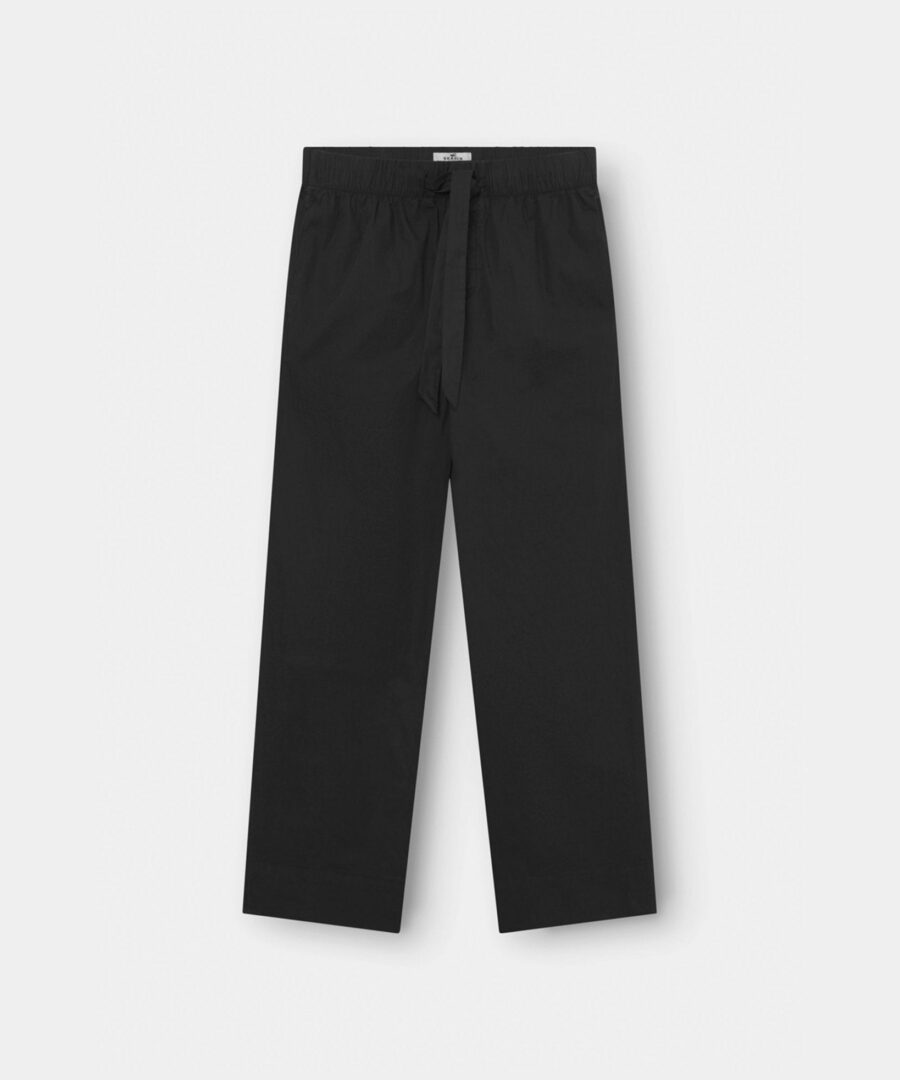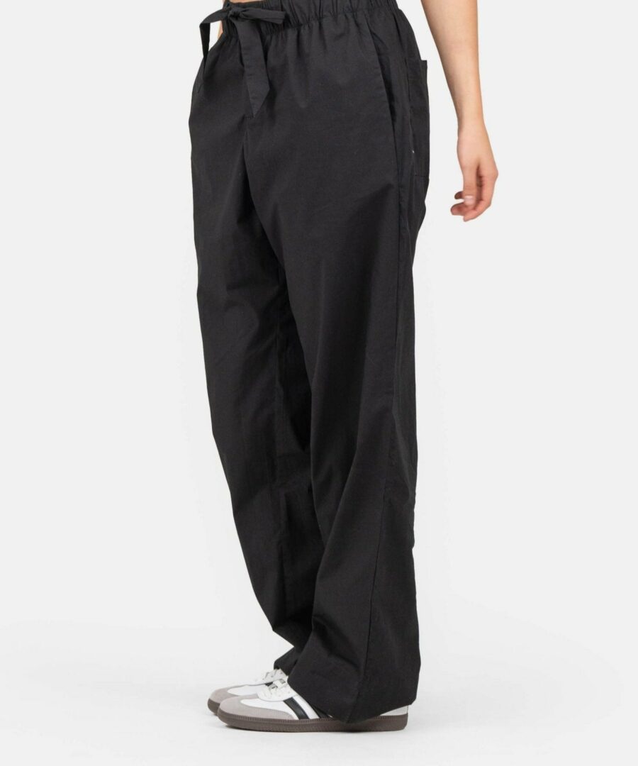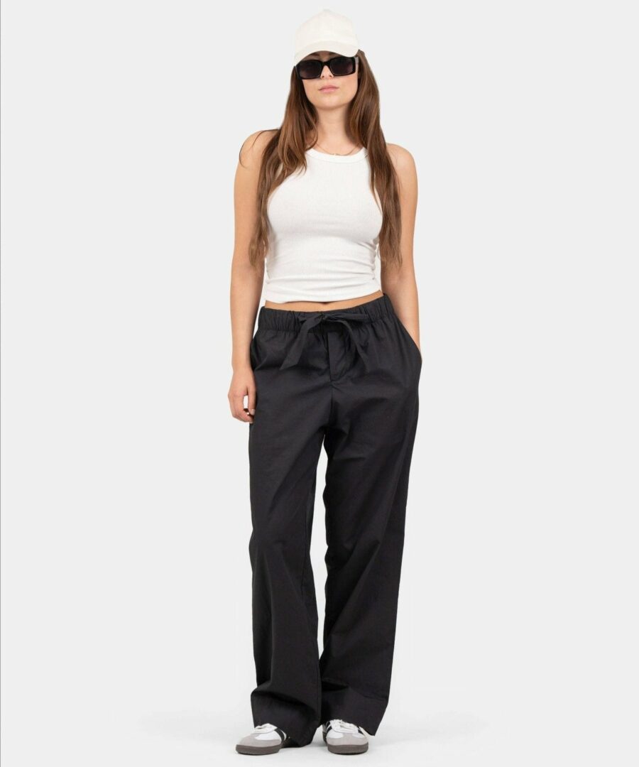 These loosely seated cotton pants in black offer comfort and style for any occasion. With a tie tape at the front and elastic edge, the pants combine lightness with a modern style. They are airy and lightweight and have practical pockets on the side as well as two back pockets. Available in .