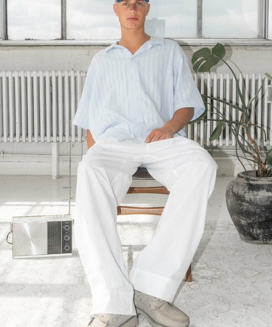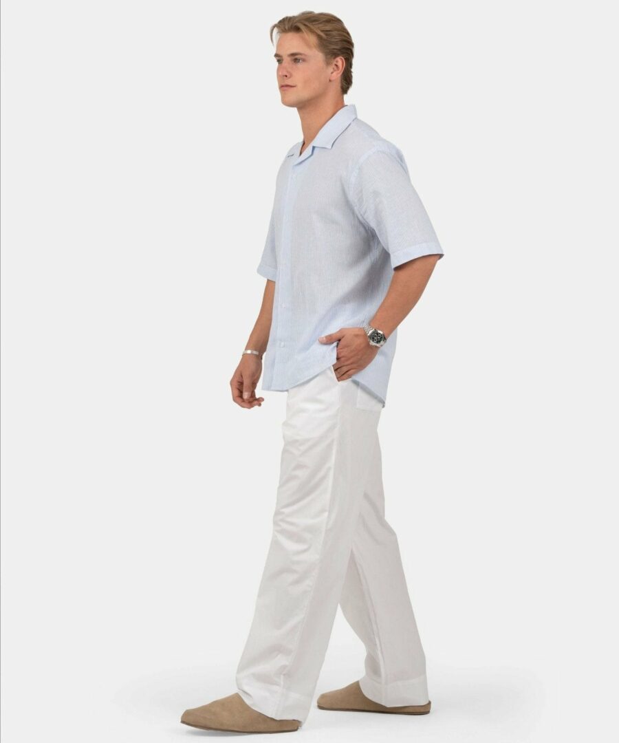 These loosely sitting cotton pants in white offer comfort and style for any occasion. With a tie tape at the front and elastic edge, the pants combine lightness with a modern style. They are airy and lightweight and have practical pockets on the side as well as two back pockets. Also available in . Combine your white pajamas pants with our For a stylish yet relaxed look.