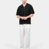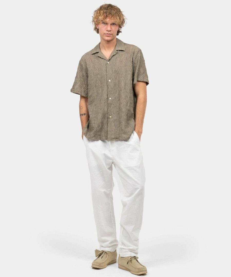 This luxurious Jacquard woven In Army has a fresh and summery look. With its structure and loose fit, it is the perfect choice for the hot months. The shirt combines style and comfort in an elegant way, ideal for relaxed days or a walk on the beach. Style our short -sleeved jacquard shirt in army with a pair of for an informal and relaxed look, or with a pair For a more classic expression
