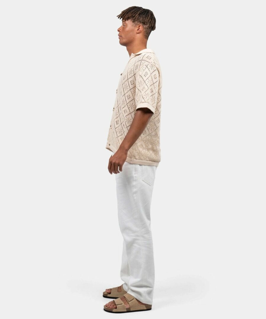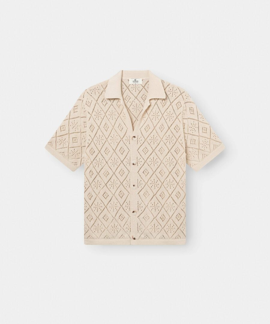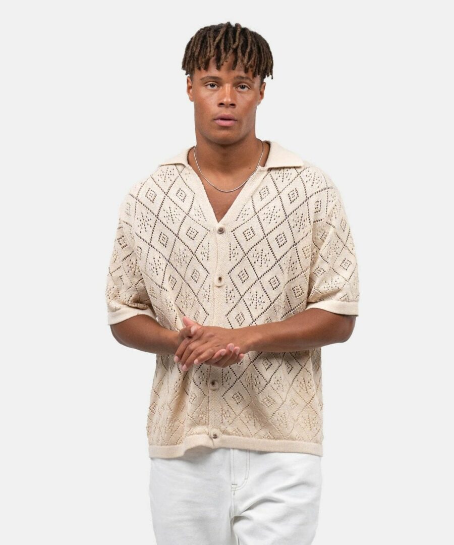 This crocheted short -sleeved shirt in beige has a fresh and summery look. With its “hollow” structure and loose fit, it is the perfect choice for the hot months. The shirt combines style and comfort in an elegant way, ideal for relaxed days or a walk on the beach. Style our beige chrochet shirt with a pair of To get a bright and summery expression, or with a couple To achieve a more casual look